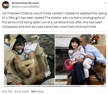 Photos of a child allegedly raped by former US president Barack Obama, purportedly released after the unsealing of court documents naming those associated with convicted sex offender Jeffrey Epstein.