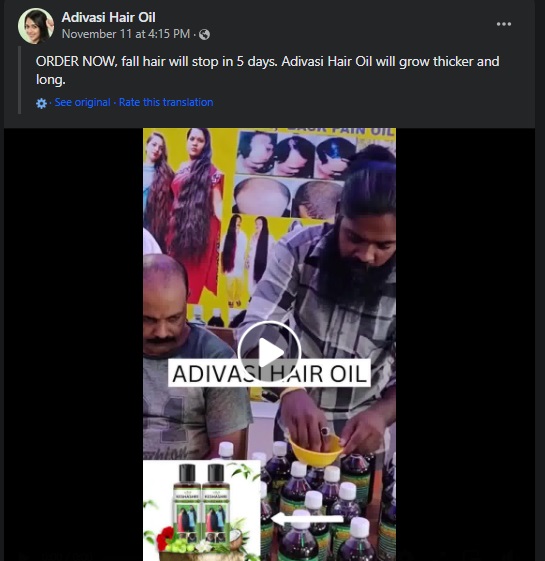 Another such advertisement, claiming to be the ‘original’ product, features a different set of ‘Adivasi healers’, making similar claims of stopping hair fall completely and reversing balding.