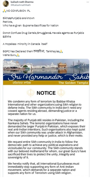 A notice, purportedly from the Golden Temple, Amritsar, has gone viral on social media, amid the escalating tensions between Indian and Canada owing to the Khalistan issue, particularly among a slice of the Sikh diaspora in Canada. The viral notice states that all international gurudwaras must immediately stop supporting any anti-India movement that demands for a separate nation and supports any form of terrorism using the Sikh religion, particularly condemning banned terrorist group Babbar Khalsa International.