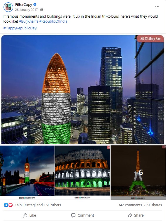 A quick reverse image search on image claiming to show Christ The Redeemer lit up in Indian tricolour led us to a Facebook post by FilterCopy, dated January 26, 2017, captioned, “If famous monuments and buildings were lit up in the Indian tri-colours, here’s what they would look like! #BurjKhalifa #RepublicOfIndia,” The post featured a set of nine images showing popular monuments and buildings across the world lit up in the three colours of the Indian National flag.