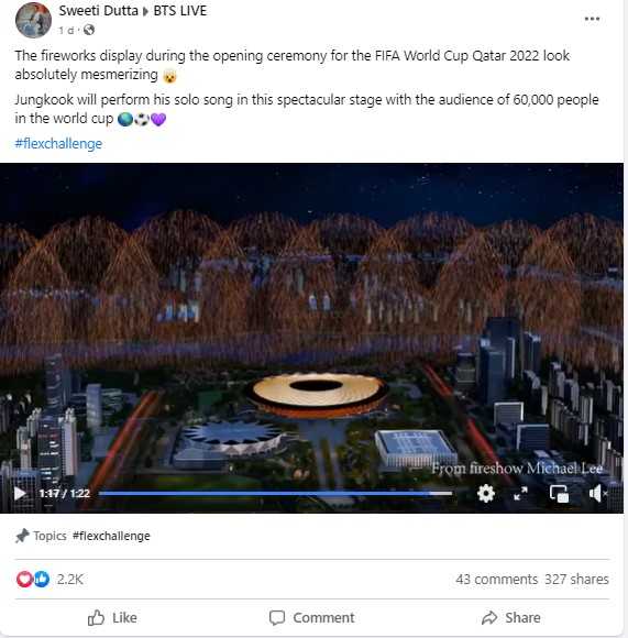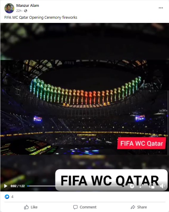 The most recent post from November 15, 2022, carried the viral video along with the caption “Its just for FIFA World Cup Qatar 2022 Fireworks Opening (sic)”