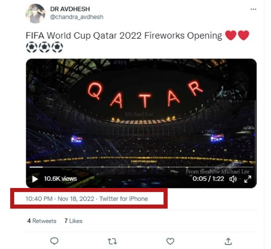 We began our investigation by looking up keywords “FIFA, “ “Qatar” & “Fireworks” on Twitter, and found a tweet by @chandra_avdhesh, dated November 18, 2022. Displaying the viral video, the post stated, “FIFA World Cup Qatar 2022 Fireworks Opening.”