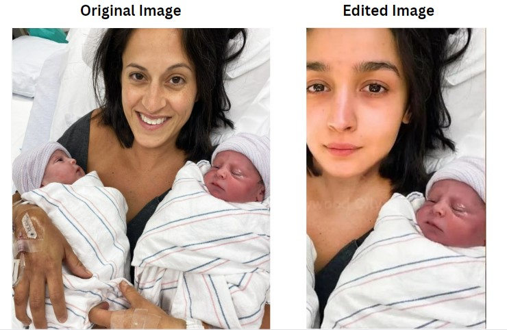 We could thus conclude that the viral photograph claiming to show the “first look” of actress Alia Bhatt with her newborn daughter has been digitally altered.