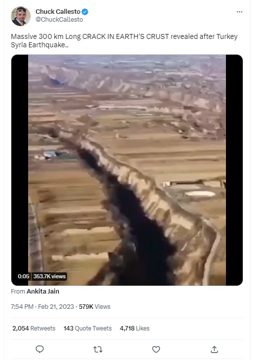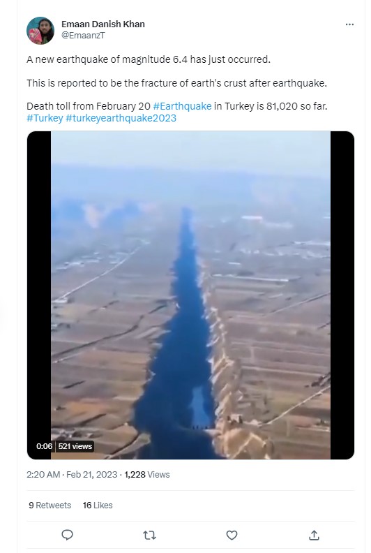 We could thus conclude that the viral footage claiming to show an aerial view of enormous fractures on Earth’s surface following the recent earthquakes in Turkiye is false. The video actually shows visuals from China, and is being shared in a false context.