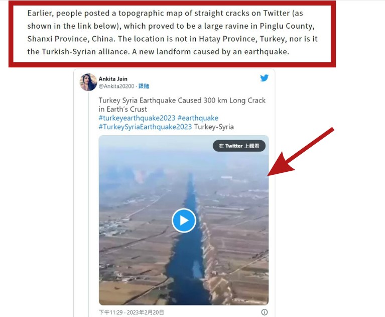 Taking a clue, we looked up “Pinglu County in China, “crack” & “earth surface” in Chinese on Google, which led us to a report by World Journal, dated February 20, 2023. It featured a tweet carrying the viral footage, and stated that the Twitter users have posted a topographic video showing cracks on the earth surface, which was later proved to be a large ravine in Pinglu County, Shanxi Province, China. The video does not show visuals from Hatay province of Turkiye.(translated from Chinese using Google Translate)