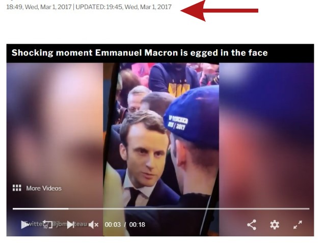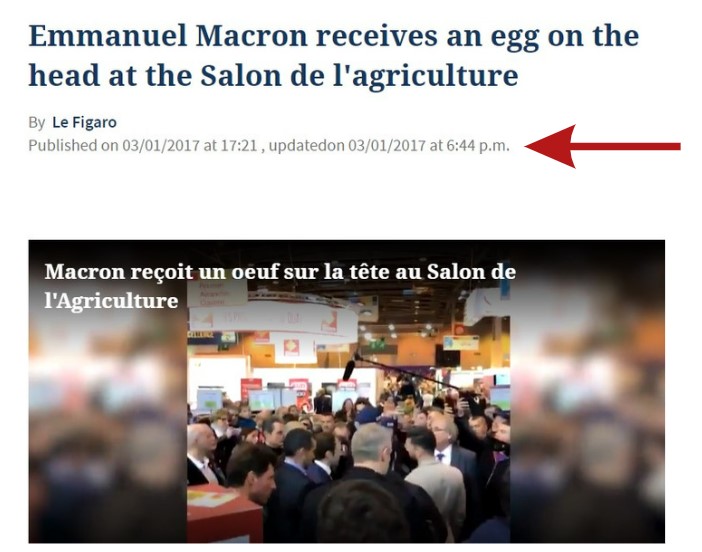 One such report by Le Figaro, dated March 1, 2017, featured footage of the incident from a different angle, and stated “We no longer count the muscular exchanges between Emmanuel Macron and the French people he meets on his way. On Wednesday, during his long visit to the Agricultural Show, the presidential candidate received an egg on the head… (translated from French by Google)”