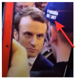 In the footage featured in the Express report, we spotted “2017” written on the cap of the man talking with Macron.