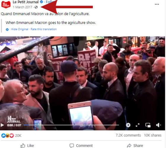 Further, we found that the viral footage was posted on the official Facebook Page of Le Petit Journal on March 1, 2017, with the caption, “When Emmanuel Macron goes to the agricultural show (translated from French by Google)”