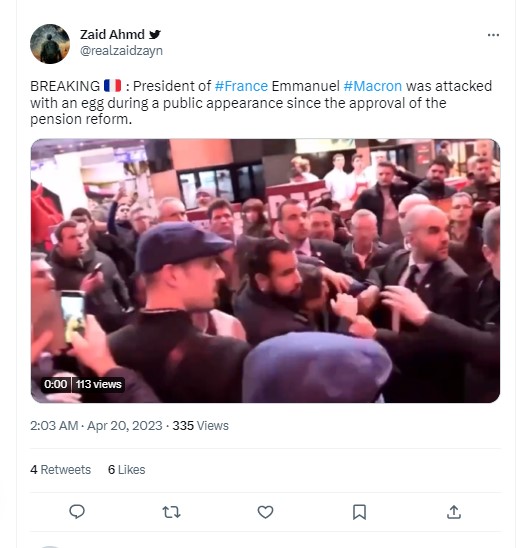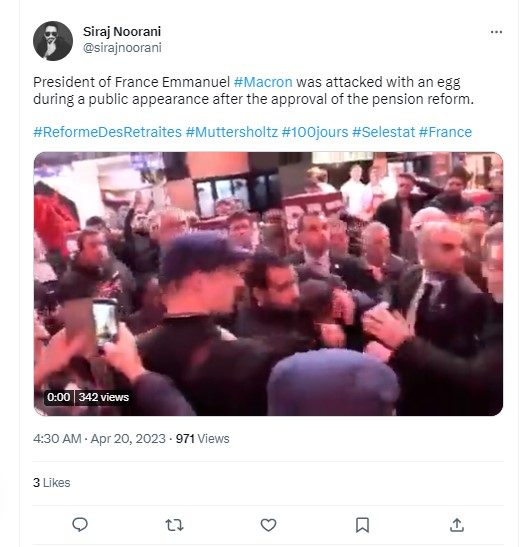 News outlet Mirror Now also shared the video on their verified Facebook page with the caption, “French President Emmanuel Macron heckled once again. Man throws egg at Macron during a public appearance after the approval of the pension reform…”