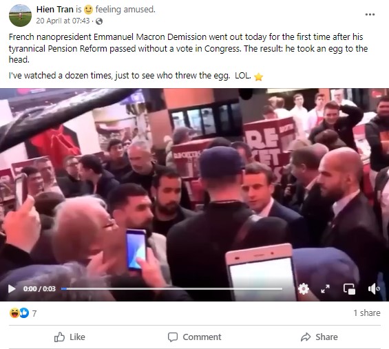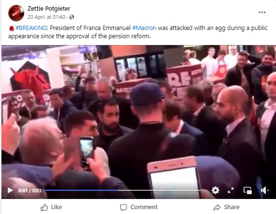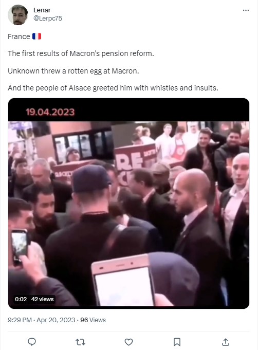 Several social media users shared the video to show that Macron was “attacked with an egg” during a public appearance after the approval of the pension reforms.