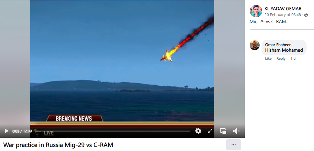 In the video, a military equipment known as Counter rocket, artillery, and mortar (C-RAM) is seen trying to shoot down a fighter jet which is seen firing at the C-RAM and the area around it. A person can also be heard narrating the incident, claiming that the fighter jet in the footage is Russian which is trying to escape a Ukrainian C-RAM.