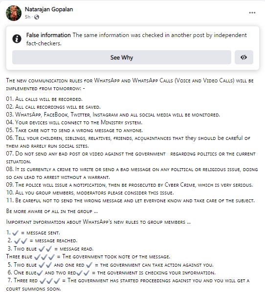 A text message is being widely shared on WhatsApp and social media platforms, which warns users about the ‘New Communication Rules for WhatsApp messages and calls’ according to which all the government will monitor it, record all WhatsApp calls, check your messages, and monitor your device. The message also warns about a new system of coloured tick marks on messages that would indicate that the government had “taken note of your message” and could take action against the sender. Newschecker found these claims to be untrue.