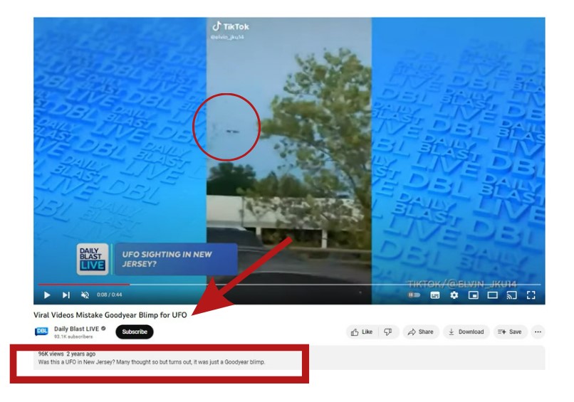 A keyword search for “blimp,” & “UFO” on Google led us to a video report by Daily Blast LIVE, dated September 17, 2020. Displaying snippets similar to the one seen in the first section of the viral clip, the report elaborated, “Was this a UFO in New Jersey? Many thought so but turns out, it was just a Goodyear blimp.”