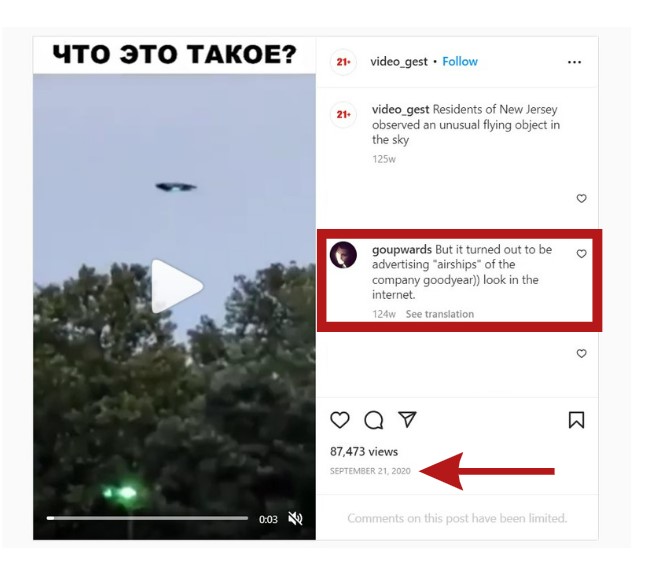 A Yandex reverse image search on the keyframes of the viral video led us to an Instagram post by @video_gest, dated September 21, 2020. Carrying the viral footage, the post stated (translated from Russian), “Residents of New Jersey observed an unusual flying object in the sky.”