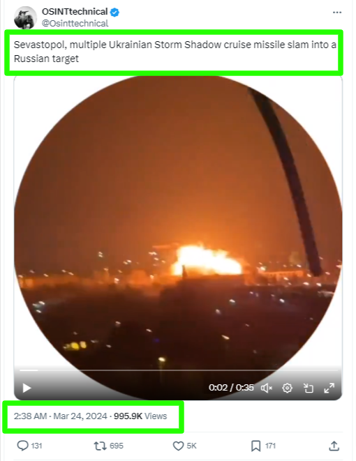 Notably, the Telegraph credited the video to X user @Osinttechnical, a journalist. We scanned the account, and found that the video was shared on March 24, 2024 with the caption, “Sevastopol, multiple Ukrainian Storm Shadow cruise missile slam into a Russian target.”