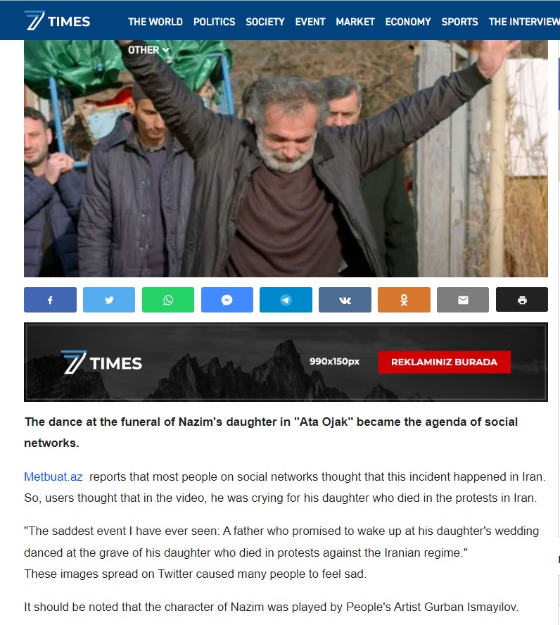 Displaying a keyframe from the viral video, the article stated, “The dance at the funeral of Nazim’s daughter in ‘ata ocagi’ became the agenda of social networks… It should be noted that the character of Nazim was played by People’s Artist Gurban Ismayilov. (translated from Azerbaijani)”