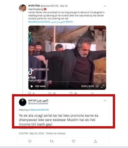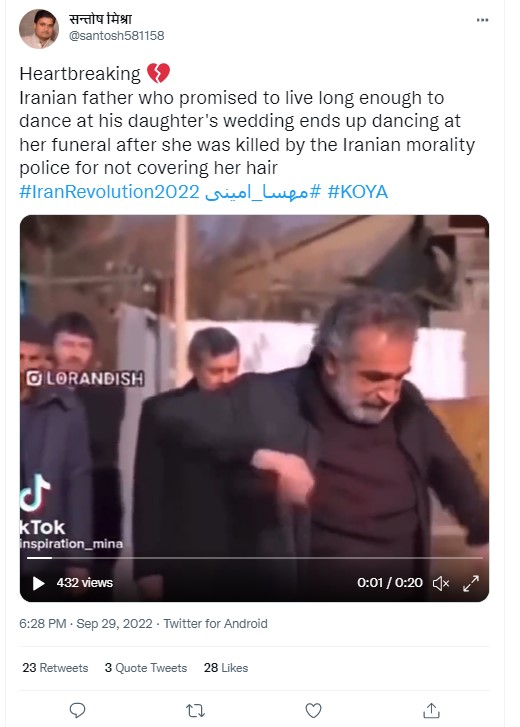 It is in this backdrop that a video is going viral claiming to show a man dressed in black dancing in slow motion. The caption being shared with the video claims that this man was Iranian and that this video shows him dancing at his daughter’s funeral. It is also being claimed that this man’s daughter was “killed by the Iranian morality police for not covering her hair”. Newschecker found the claim to be untrue.