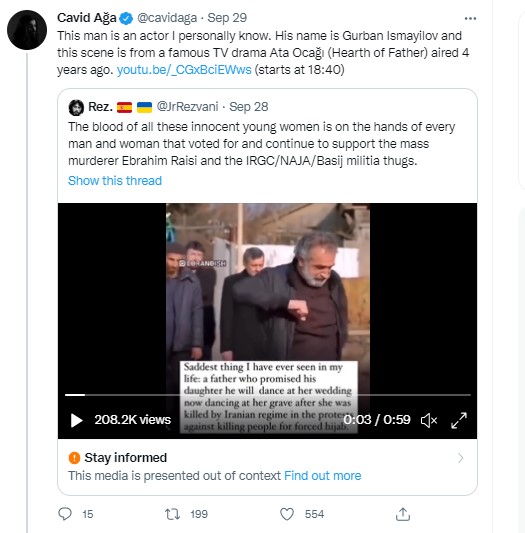 A keyword search for “Ata ocagi,” “Gurban Ismayilov,” and “Azerbaijan” led us to a tweet by journalist Cavid Ağa, dated September 29, 2022, clarifying that the video is from a serial and the man seen in the clip is actually actor Gurban Ismayilov.