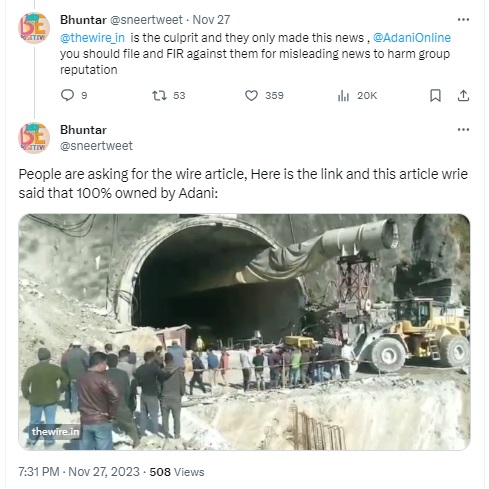 Newschecker saw that several social media users alleging the Adani Group’s involvement in the construction of the tunnel based their claims on a report published in The Wire, dated November 18, 2023, headlined, “Who Was Building the Uttarakhand Tunnel That Collapsed?”. We received the claim on our Whatsapp tipline (9999499044), too, requesting us to fact-check it.