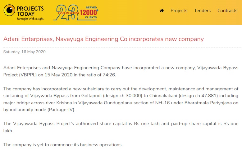 However, we found that the Adani Group’s name had reportedly cropped up when it emerged that its flagship firm Adani Enterprises and Navayuga Engineering Company had incorporated a new company, namely ‘Vijayawada Bypass Project’ on May 15, 2020 in the ratio of 74:26.