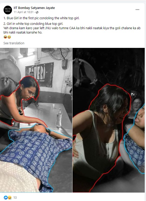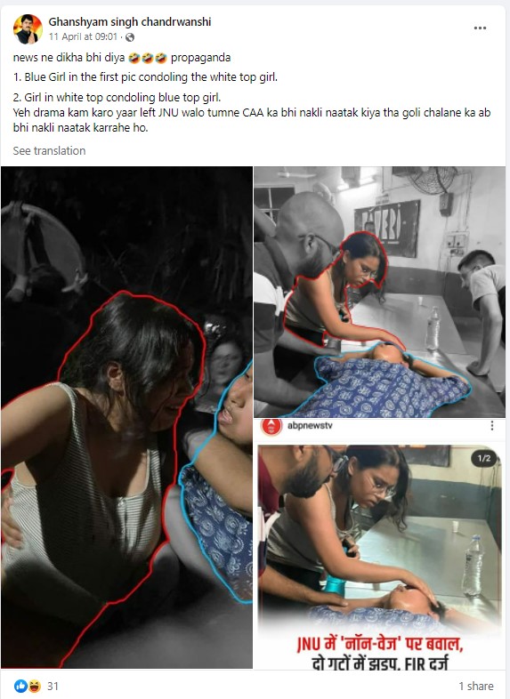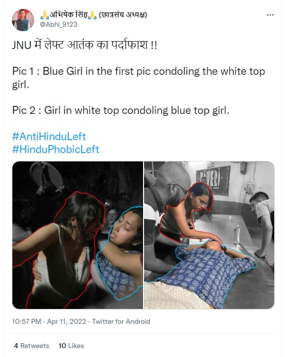 Following this, we contacted Ansari who confirmed to us that us, “the girl lying on the table in the second image is Madhurima while I am the one in the grey shirt.” She added that the picture was taken at the time when the members of the ABVP attacked students. Madhurima fainted during the attack, following which she was laid on the table and Ansari was caring for her. Following this, Ansari said, “members of the ABVP went outside the Kaveri hostel and started throwing stones, plants, and bottles at students inside the hostel. I was in the lawn when I was hit by a stone hurled by the ABVP members and started to bleed heavily.”