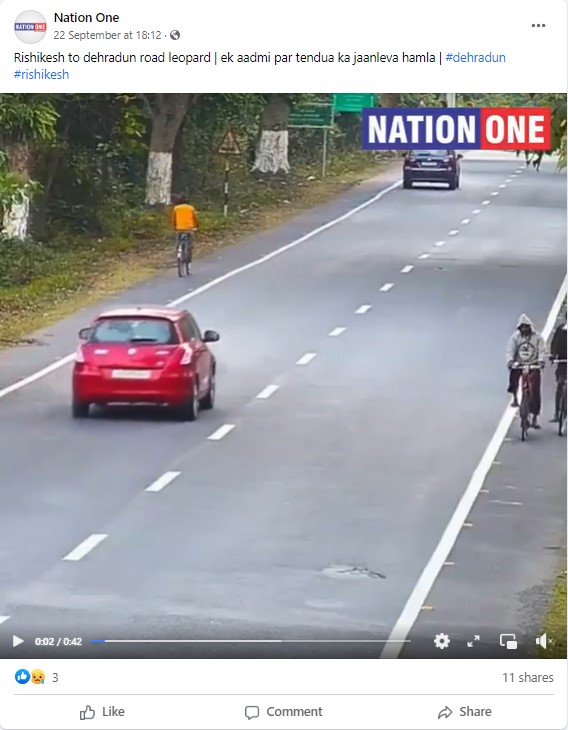 A video showing a “big cat” pouncing at and attacking a man as he cycles down a highway, before scampering away into the woods, is going viral on social media platforms. The shocked cyclist can be seen picking up his vehicle and rushing away from the spot, from the other side of the road. Several social media users shared the video claiming to show a leopard attacking a cyclist on Dehradun-Rishikesh road in Uttarakhand. Newschecker found the claim to be untrue.