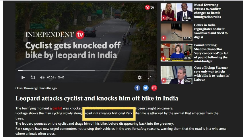 A keyword search for “man on cycle attacked by animal” on Google led us to multiple video reports from June 2022. One such report by Independent, dated June 15, 2022, featured the viral footage of leopard pouncing on a cyclist and stated that the incident took place at Kaziranga National Park in Assam.