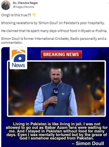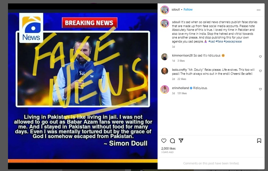 Newschecker ran a keyword search for “Simon Doull Pakistan jail”, which led us to his Instagram profile, where he calls out news outlets for publishing “false stories made up by fake social media accounts”.