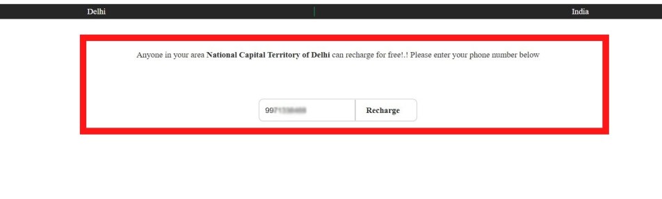 Following this, a message appeared on screen, saying ” Anyone in your area National Capital Territory of Delhi can recharge for free!.! Please enter your phone number below ” with space to fill the number.