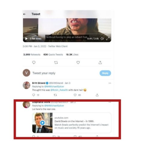 A user @Stephwolfe101 shared the YouTube link to the “real” 1999 David Bowie interview.