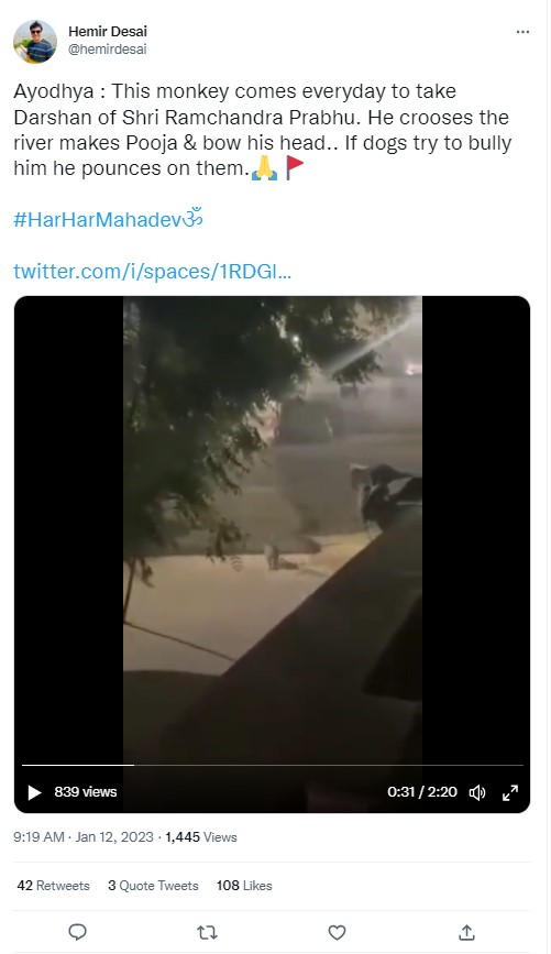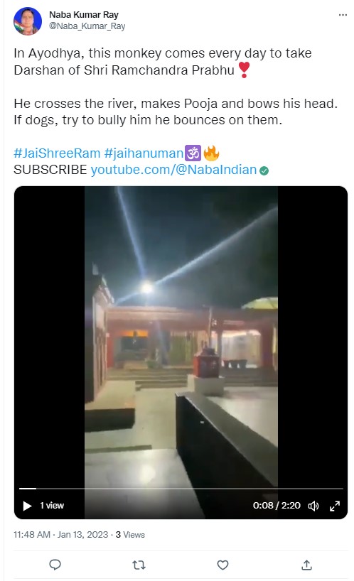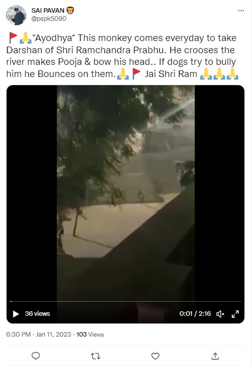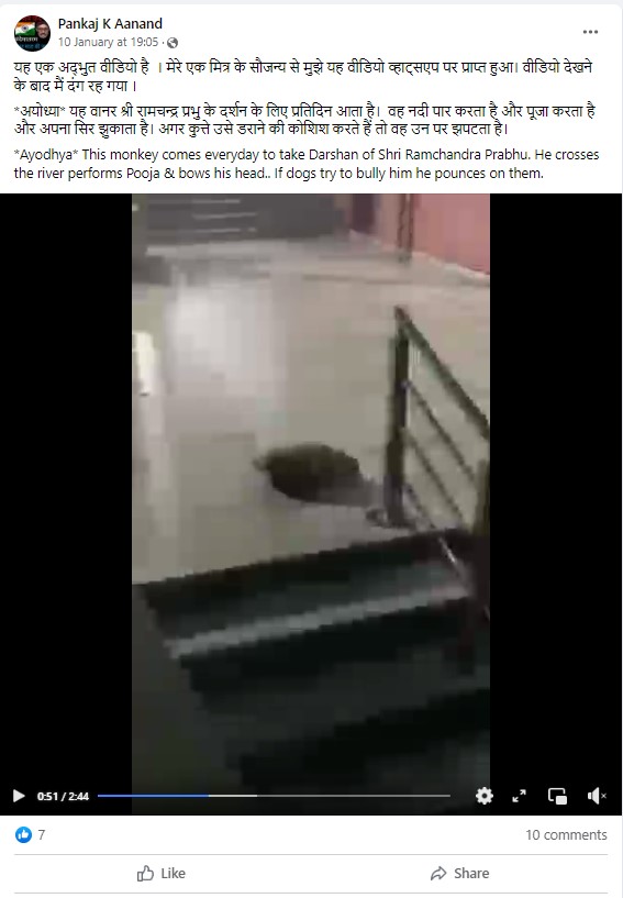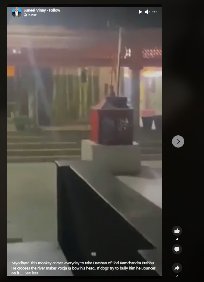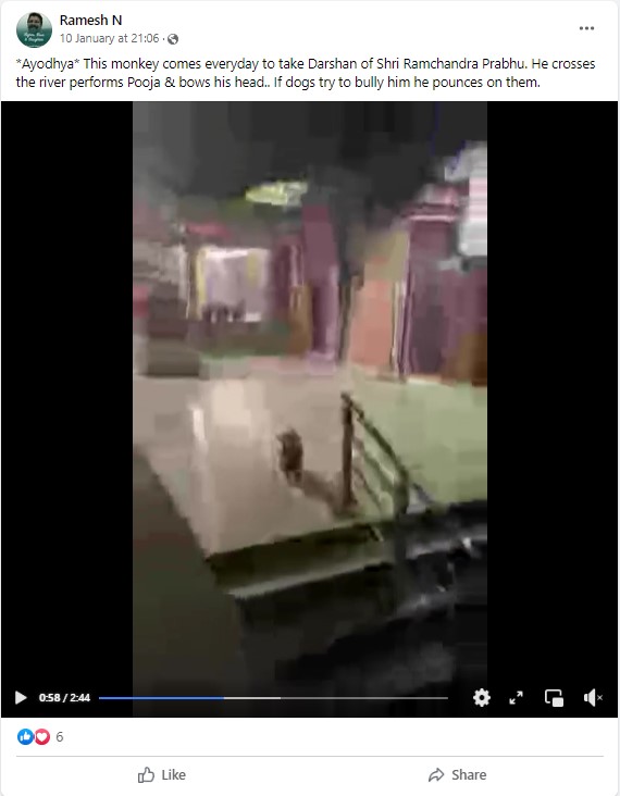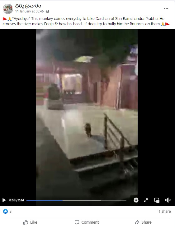 Several Facebook users shared the footage with the caption, “*Ayodhya* This monkey comes everyday to take Darshan of Shri Ramchandra Prabhu. He crosses the river performs Pooja & bows his head.. If dogs try to bully him he pounces on them. (sic)”