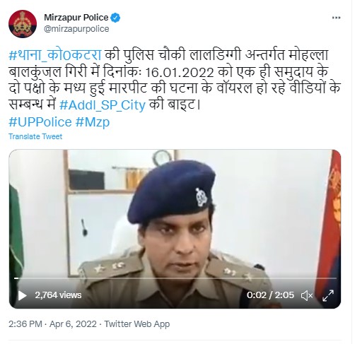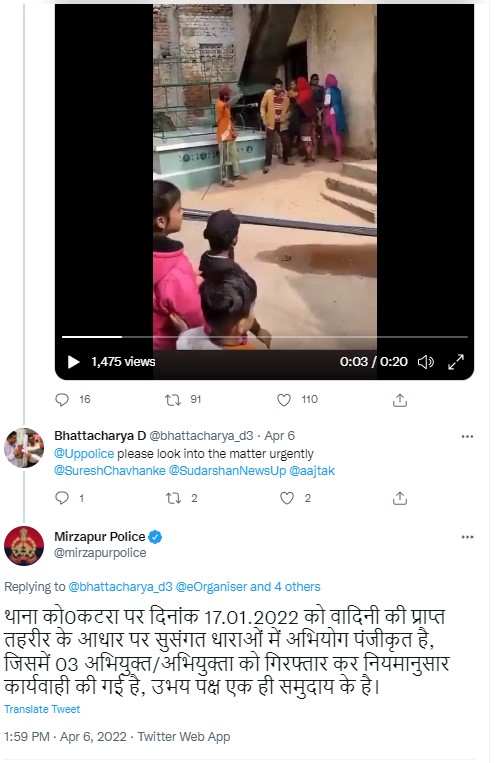 To verify the veracity of the claim, we scanned through the comment sections of the tweets associated with the viral video and found a reply by the official handle of Mirzapur police which roughly translate to, “On the basis of complaint received by the plaintiff on 17.01.2022 at Katra police station, the case has been registered in the relevant sections, in which 03 accused/accused have been arrested and action has been taken as per the rules, both the parties belong to the same community.”