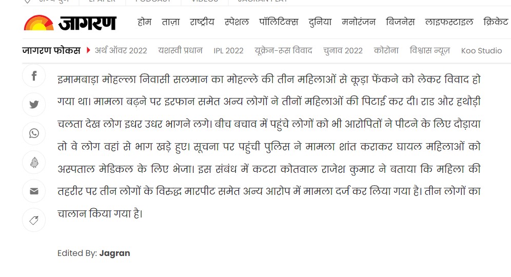 Newschecker conducted a keyword search for “Mirzapur dispute over throwing garbage” and found a report by Jagran dated January 17, 2022.
