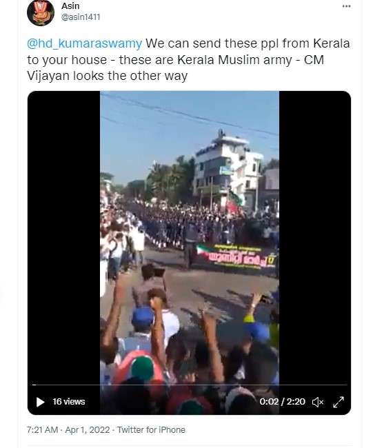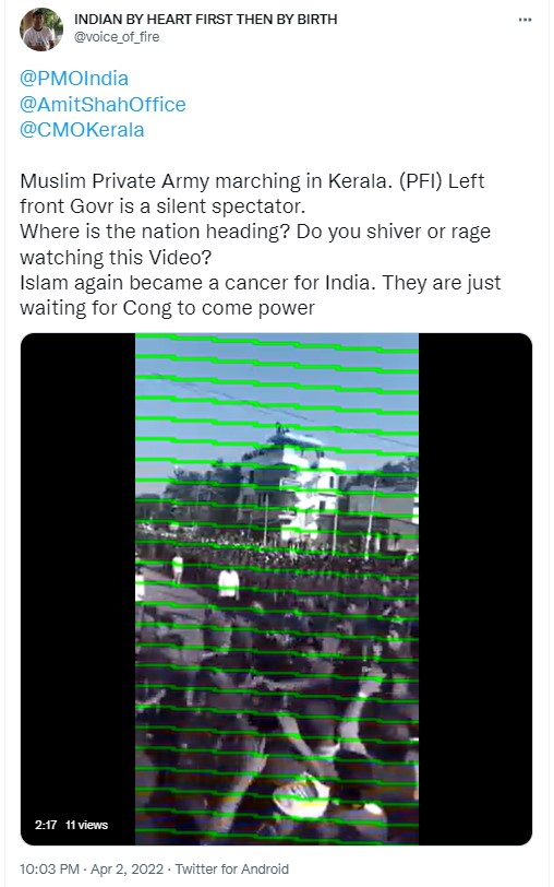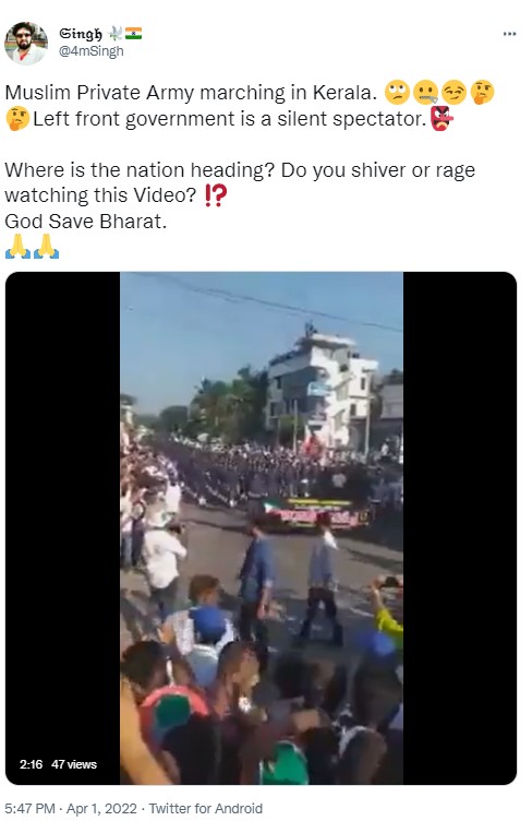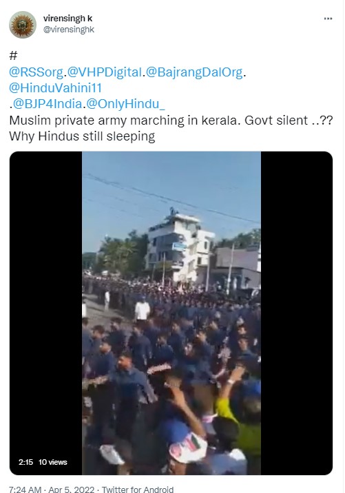 The opposition leaders have often accused the CPI-M government in Kerala and CM Pinarayi Vijayan of “religious appeasement” favouring the minority community at the cost of the Hindus in the state. In this context, a video claiming to show “Muslim Private Army marching in Kerala,” is doing the rounds on social media platforms with the users calling out the “Left front government” a “silent spectator.” Newschecker found the claim to be untrue.