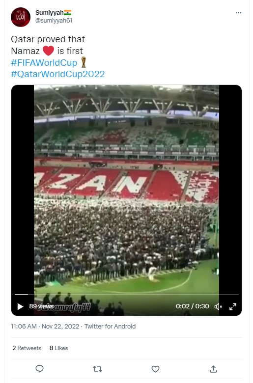 Several Facebook and Twitter users shared the viral clip applauding Qatar, an Islamic nation, for sticking to its traditions. Newschecker found the claim to be untrue. The video is old and unrelated to the ongoing tournament in the Arab country.