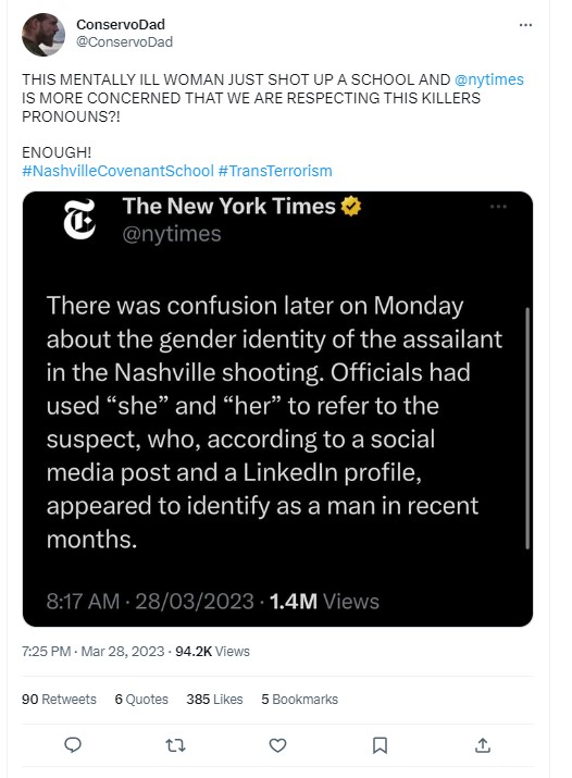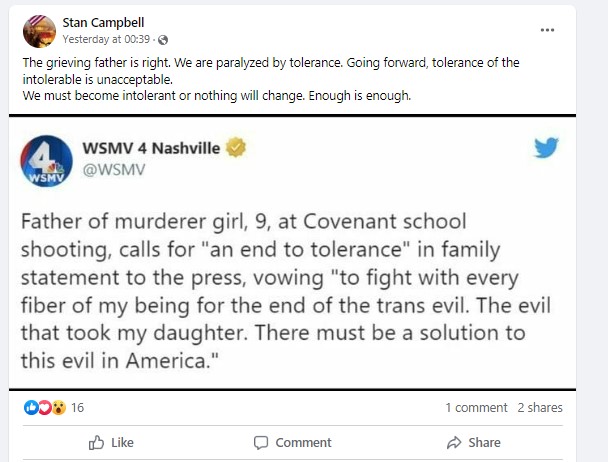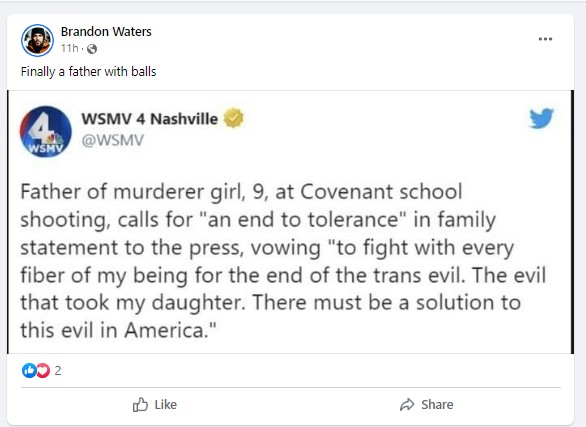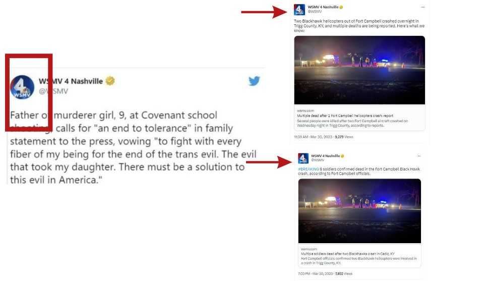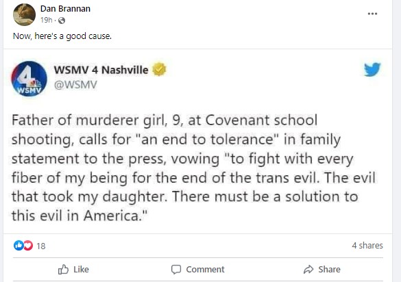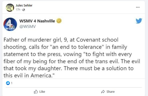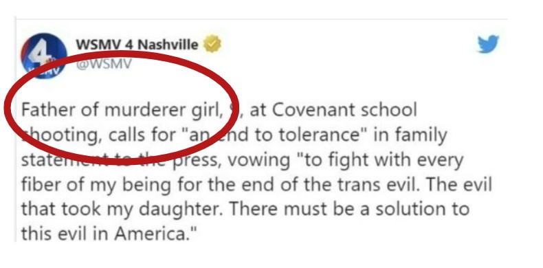 The full text of the alleged tweet by WSMV4 stated, “Father of murderer girl, 9, at Covenant school shooting, calls for “an end to tolerance” in family statement to the press, vowing “to fight with every fiber of my being for the end of the trans evil. The evil that took my daughter. There must be a solution to this evil in America.(sic)”