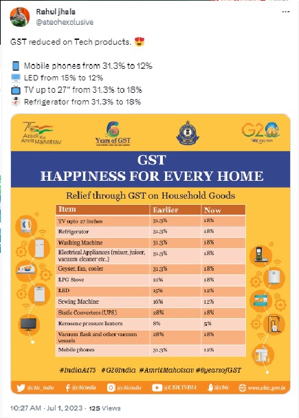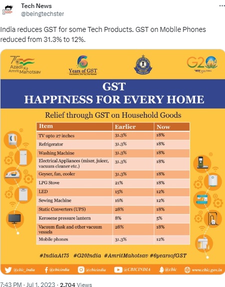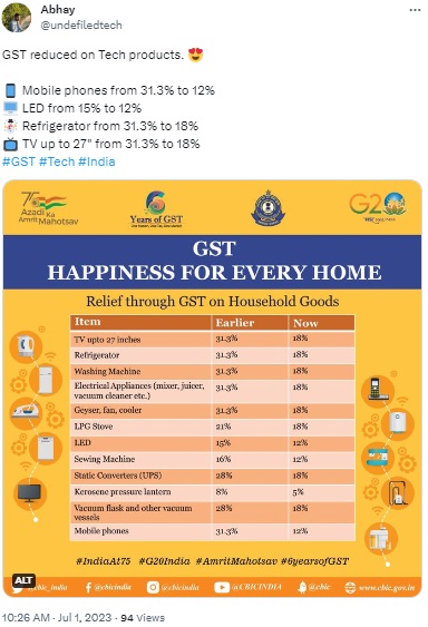 According to the graphic, the GST rates on TVs, washing machines and refrigerators have been reduced from 31.3% to 18%, while for mobile phones, it has been slashed from 31.3% to 12%. “In a major relief for the people of India, the Union Finance Ministry has announced a reduction in Goods and Service Taxes (GST) on the purchase of electronic items on the 6th anniversary of the GST implementation,” read a Zee News report, dated July 3, 2023. Similar news reports can be seen here and here.