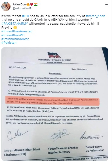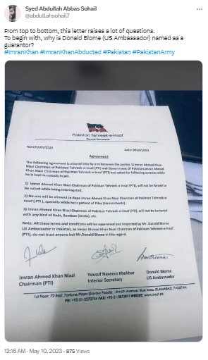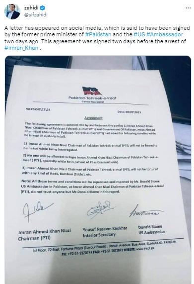 A letter has gone viral on social media, purportedly of an agreement signed between former Pakistan Prime Minister Imran Khan, interior secretary Yousuf Khokhar and the US ambassador to Pakistan Donald Blome, where Khan requested certain bizarre “sureties” in case of his recent arrest over corruption charges.