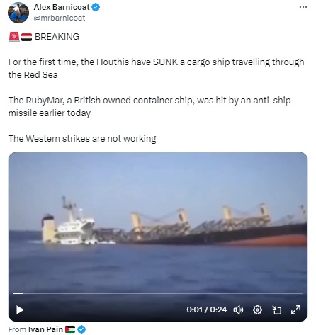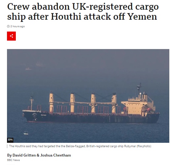 The US Central Command had said that two anti-ship ballistic missiles were launched from Houthi-controlled areas in Yemen toward a Belize-flagged, British-owned ship, the MV Rubymar, in the Gulf of Aden on Sunday, but that only one missile struck the ship. Yemen’s Houthi militants, too, said they had attacked the Rubymar cargo vessel in the Gulf of Aden which was at risk of sinking, raising the stakes in their campaign to disrupt global shipping in solidarity with Palestinians in the Gaza war. A merchant vessel and a coalition warship assisted the crew members, who abandoned ship and were safely transported to a nearby port.