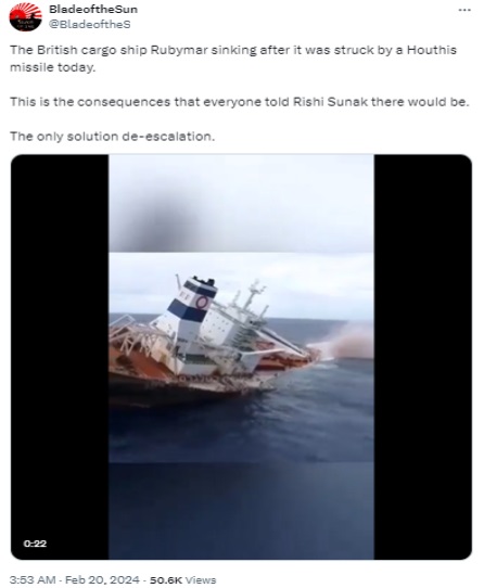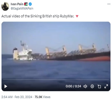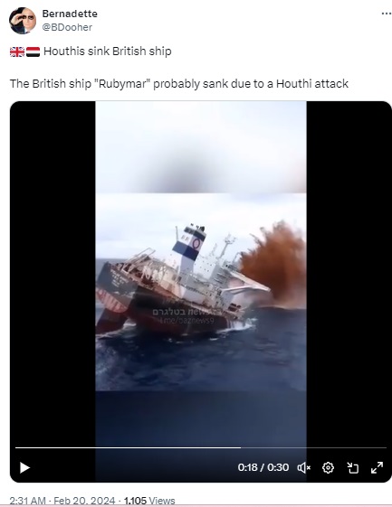 Several social media users are circulating a couple of video clips, one having a duration of 30 seconds and the other with 24 seconds, claiming them to be footage of the sinking British cargo ship, Rubymar, after it was struck by a Houthi missile off Yemen.