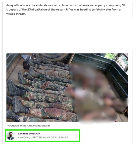 We also found an India Today report, dated May 5, 2015, on an ambush by the Naga militants on the army soldiers. Carrying a photograph of the martyred soldiers, it elaborated, “In the deadliest ambush by Naga militants since the collapse of a 14-year ceasefire, seven Assam Rifles (AR) troopers and a Naga territorial army soldier were killed in an IED ambush laid by the National Socialist Council of Nagaland (Khaplang faction) in Nagaland. “
