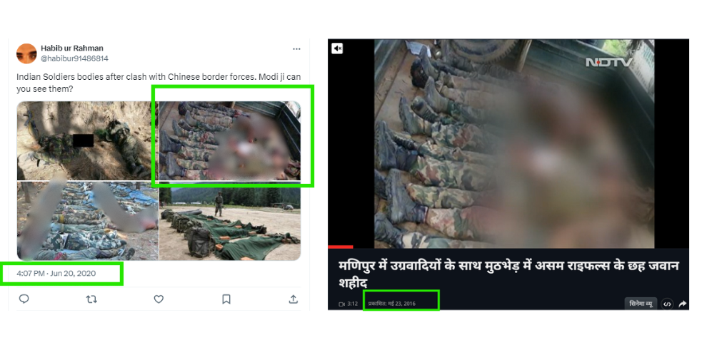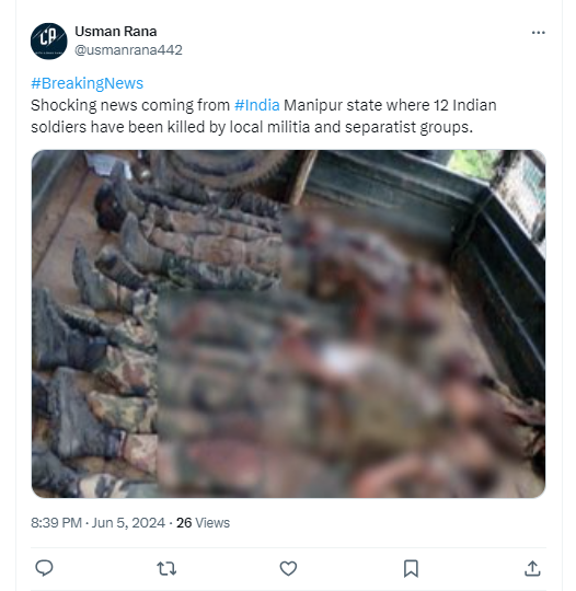 A blurred photograph showing what appears to be the corpses of men dressed in military uniform has been shared widely on social media platforms, with users claiming it to be a recent image from conflict-hit Manipur. The users further allege that the photo is of the 12 army soldiers who were killed by the local militants and separatist groups in the north-eastern state. However, Newschecker found that the photograph is old, and no such recent incident has been reported from Manipur.