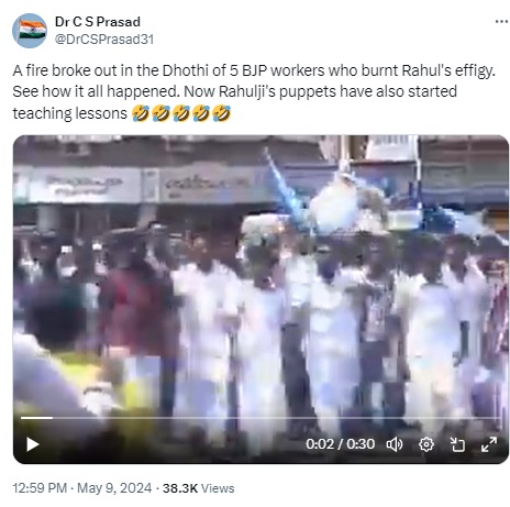 Dhotis of protesting BJP workers catch fire while burning effigy of Congress leader Rahul Gandhi.