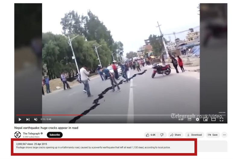 We spotted Telephragh’s watermark on the bottom right side of the frames in the viral video. Taking a clue, we looked up keywords “Earth,” & “cracks” in the search section of the official YouTube channel of The Telegraph. This led us to a video dated April 25, 2015, titled, ‘Nepal earthquake: huge cracks appear in road.’