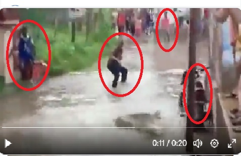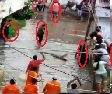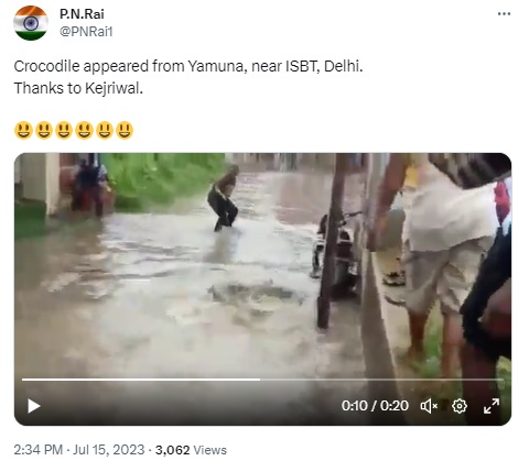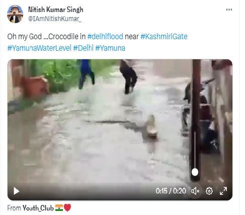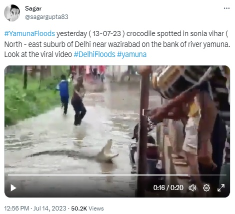 Several social media users are sharing a video of a crocodile wading through a flooded road, snapping at passers-by, claiming that it happened in a Delhi neighbourhood following the record increase in the water levels of the Yamuna River over the past week.