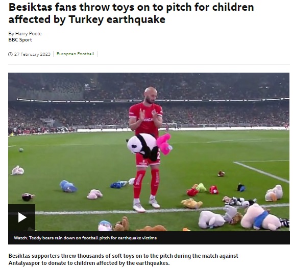 “Besiktas supporters threw thousands of soft toys onto the pitch during the match against Antalyaspor to donate to children affected by the earthquakes. The match was paused after four minutes 17 seconds, representing the time the first earthquake struck Turkey and Syria at 04:17 on 6 February,” read a BBC report, dated February 27, 2023. Similar reports can be seen here, here, here and here.