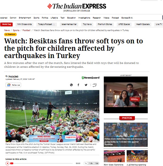 “Soccer fans in Turkey showered a soccer pitch with thousands of soft toys, all of which will go to children left orphaned and homeless after two deadly earthquakes hit the country in February. The Turkish Süper Lig game between the Istanbul-based Beşiktaş team and the Antalyaspor football club was paused four minutes and 17 seconds into the game. This was a nod to the time the first earthquake hit the country on February 6 — 4:17 a.m. local time,” read a Business Insider report, dated February 28, 2023.