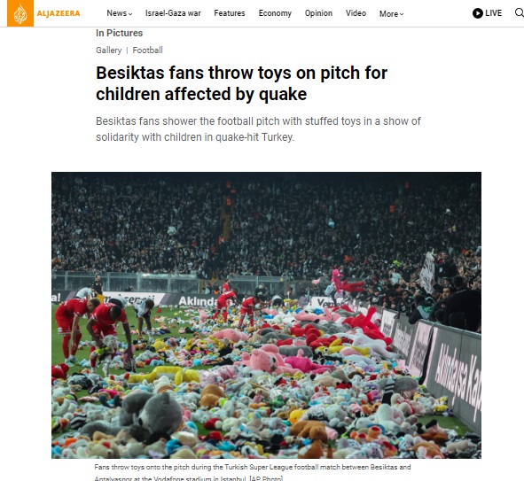 We came across a statement from Besiktas, dated February 26, 2023, on their website, which stated, “To boost the morale of children affected by the recent earthquakes, Beşiktaş supporters organised a unique donation event called “This Toy is for You,” to be held at Vodafone Park during Beşiktaş’ match against Antalyaspor. At exactly the 17th second of the 4th minute of the match, which corresponded to the time of the first earthquake, Beşiktaş supporters threw brand new stuffed toys onto the pitch. The toys will be delivered to the children living in the earthquake-hit areas with Beşiktaş aid trucks,” read the statement.
