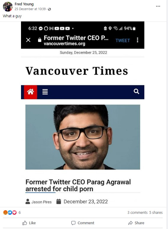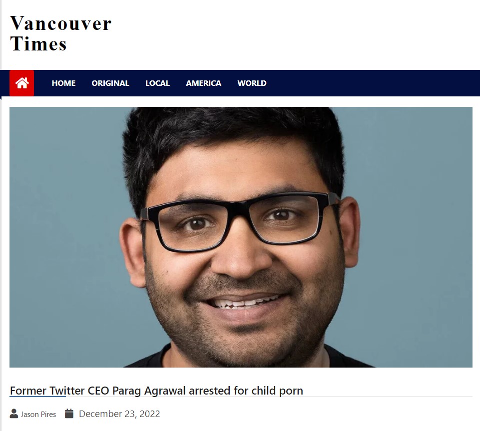 Taking a clue, we conducted a keyword search for “Vancouver Times Parag Agrawal” on Google which led us to an article published on the website on December 23, titled ‘Former Twitter CEO Parag Agrawal arrested for child porn.’