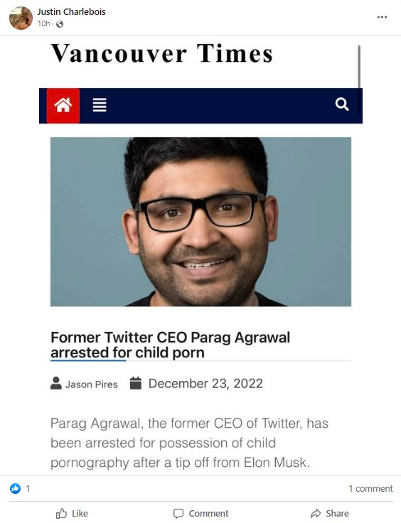 Weeks after Elon Musk confounded Twitter executives for their inaction “against child exploitation” on the platform before his take over, a screengrab of an article titled ‘Former Twitter CEO Parag Agrawal arrested for child porn,’ is being widely circulated on Facebook. It further reads, “Parag Agrawal, the former CEO of Twitter, has been arrested for possession of child pornography after a tip off from Elon Musk.” Newschecker found that the viral screengrab is from a satirical website, and not an authentic news report.